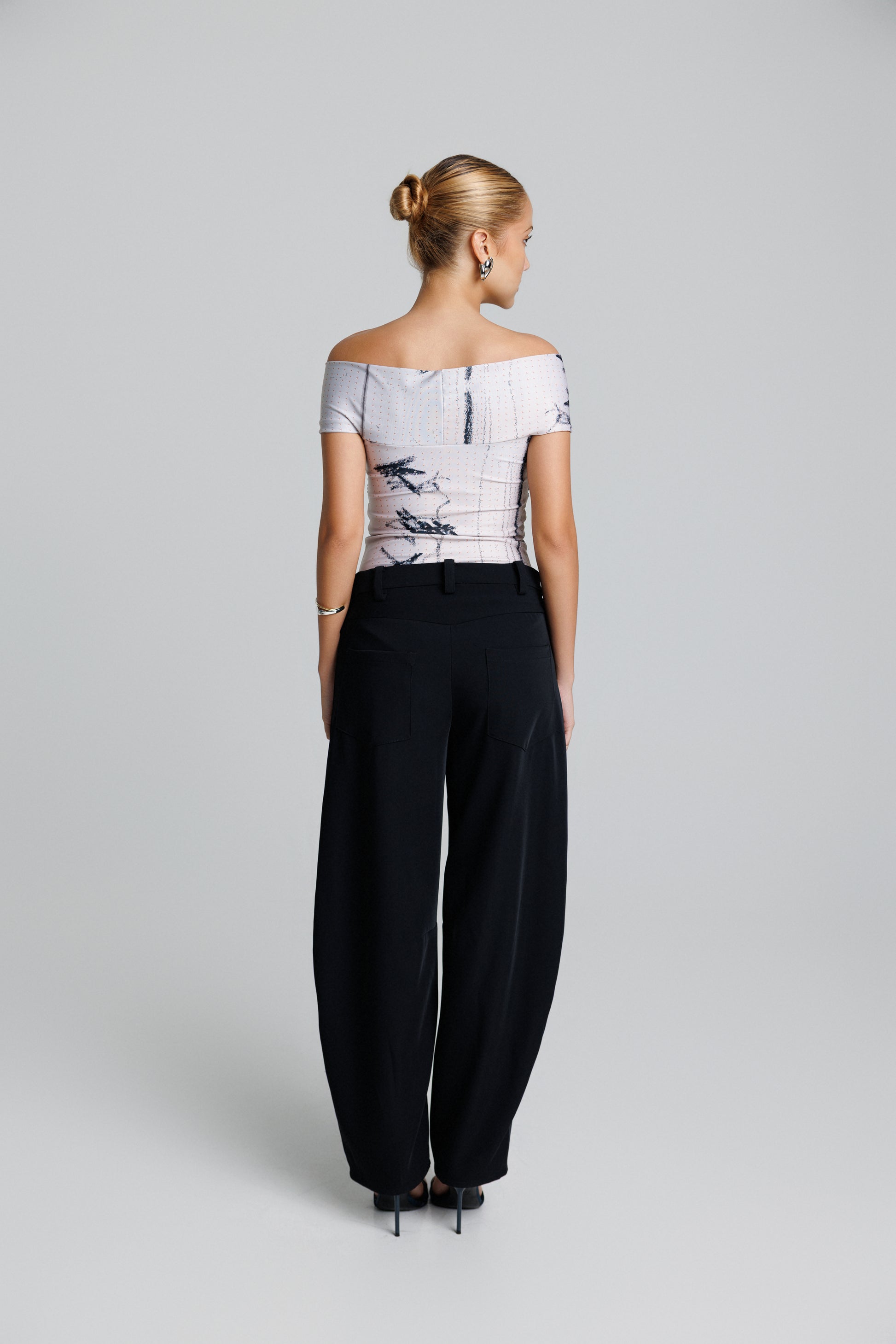 Confeccionado en una tela estructurada y cómoda, este bodysuit presenta un escote off-shoulder cruzado que enmarca el torso y realza la silueta con un aire moderno y pulido.