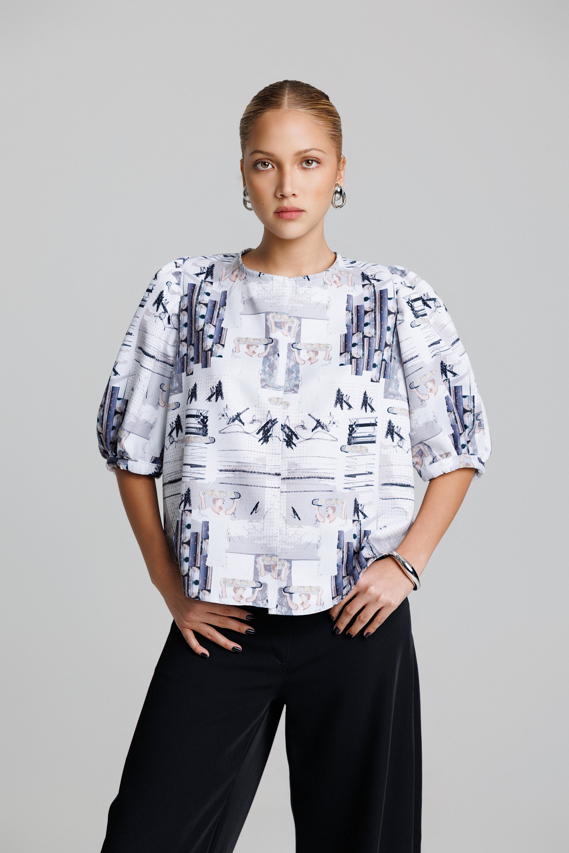Confeccionada en una tela estructurada pero ligera, presenta mangas globo suaves, un cuello redondo clásico y un cuerpo recto que cae con naturalidad, logrando un balance perfecto entre volumen, comodidad y presencia visual.