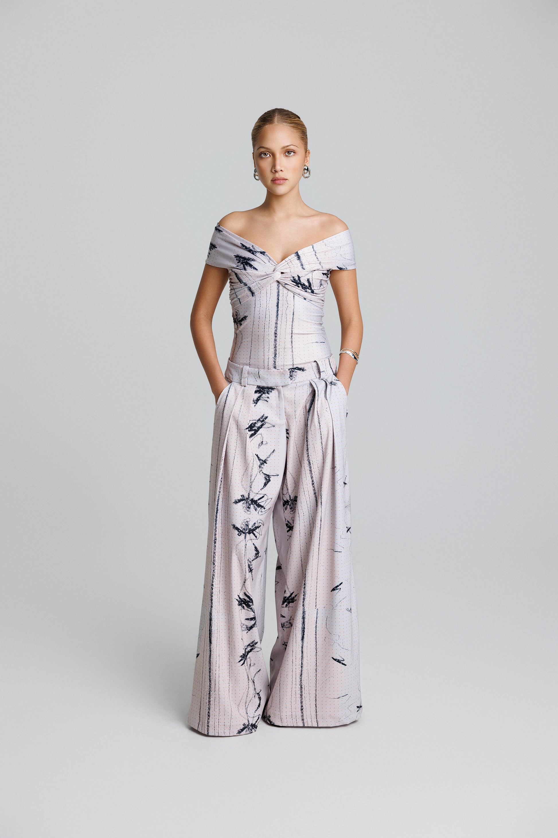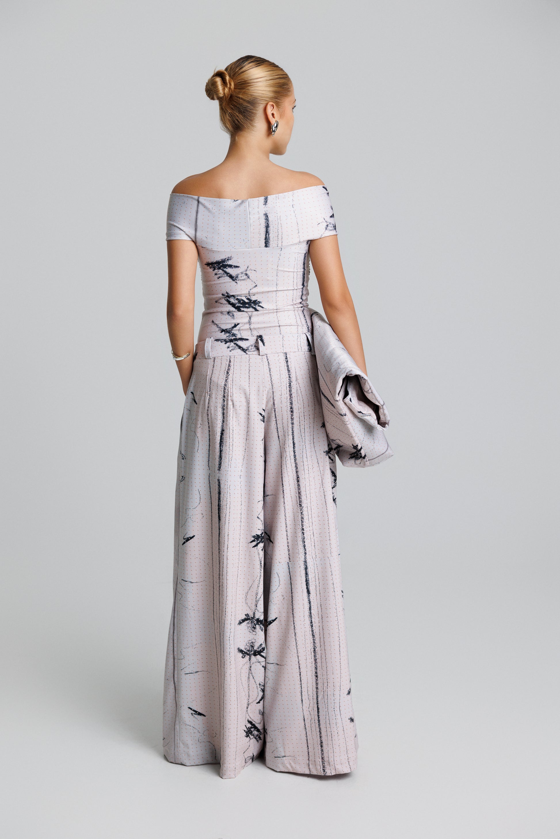 El Pantalón Escala se inspira en la suavidad de líneas ascendentes que evocan luz, movimiento y una sensación de ritmo continuo. Su estampa proviene de una obra creada a mano, posteriormente intervenida y transformada digitalmente, dando origen a un patrón artístico de trazos finos y contrastes profundos.