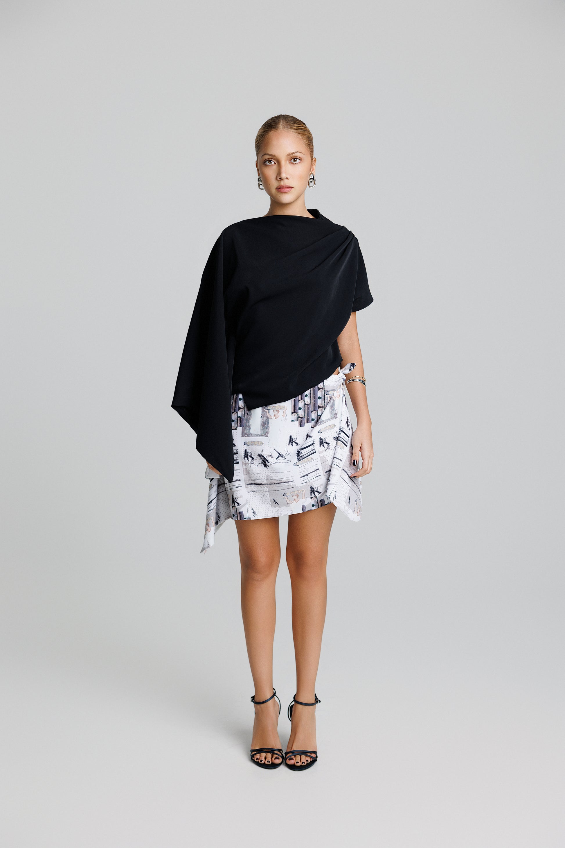 Confeccionado en un textil suave y de caída envolvente, su estructura asimétrica crea un efecto de capa que se proyecta como una silueta escultórica al moverse. El diseño combina un hombro descubierto con pliegues fluidos que aportan dramatismo y sofisticación contemporánea.